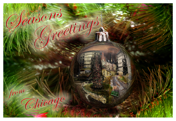 This postcard’s concept is that the ornament holds in it a “Christmas time post apocalyptic Chicago.” And that the devastated city’s aura is killing the tree around it. Detail is featured heavily in this piece, specifically inside the ornament.