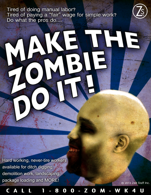 The concept for this piece is of a future world where zombies are so common place that they have become a source of cheap labor. A staffing company called Zed Staff Inc is founded to capitalize on this new source of laborers.