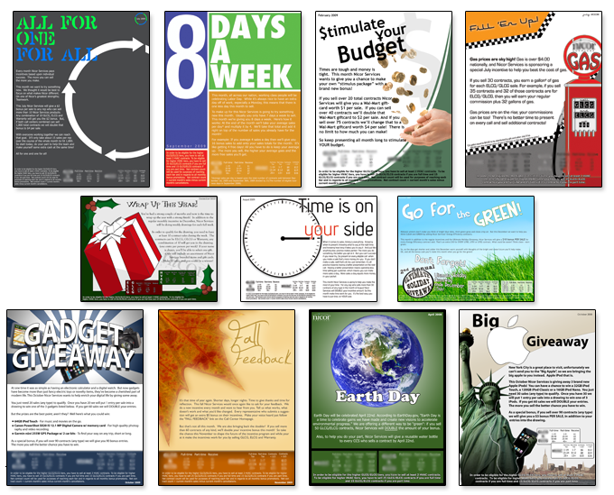 Various internal promotion fliers for Nicor National created between 2007 and 2010.
