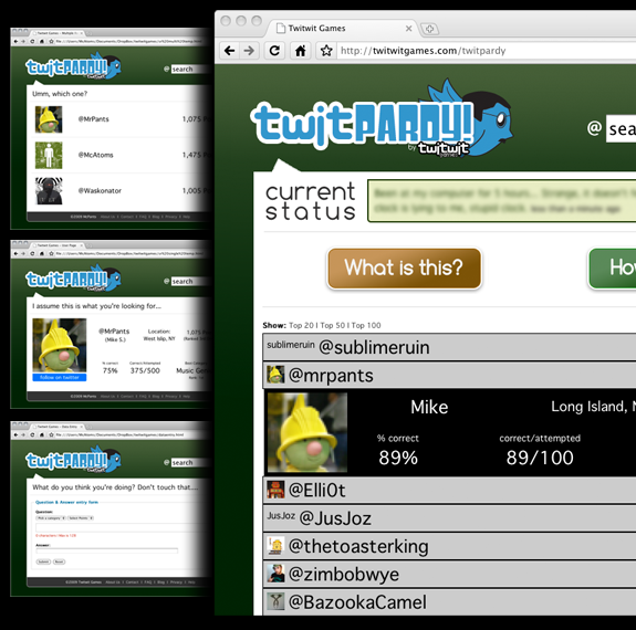 The first phase of this, launching in mid 2011, is Twitpardy! A trivia game loosely based on the TV show Jeopardy! I am responsible for the concept, writing, copy editing, and design of Twitpardy! and Twitwit Games.